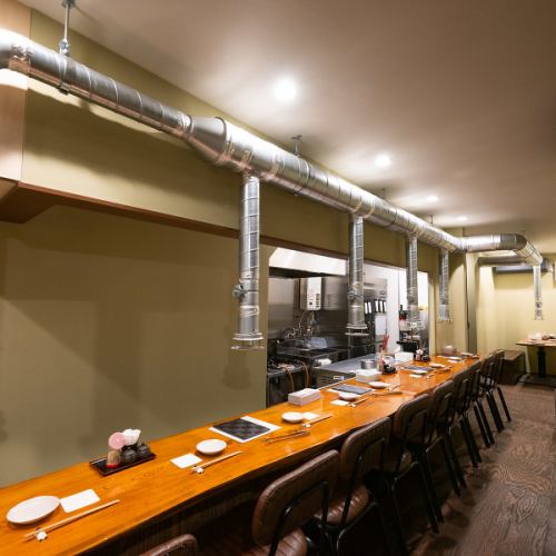 木の温もりが心地よいカウンター席は、落ち着いた雰囲気でゆっくり過ごせる人気のお席。目の前で調理が見えるライブ感も楽しめます。デートで会話が弾む距離感はもちろん、サクッと飲みたい時にも使いやすい、気軽で居心地のよいカウンターです。